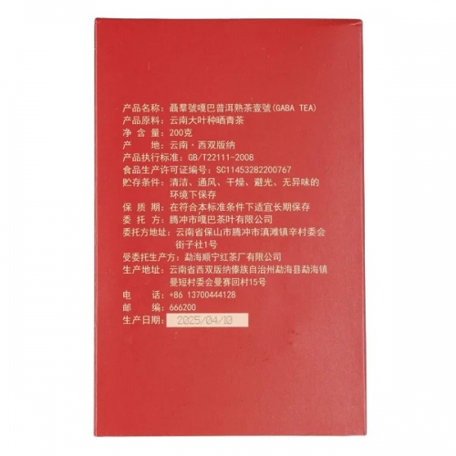 Чай изготовлен из крупнолистного сырья шайцин, собранного из старых чайных деревьев в Менхай, Сишуанбаньна (провинция Юньнань). После традиционной технологии шу пуэра партия проходит GABA-обработку в условиях ограниченного доступа кислорода, что формирует уникальный вкусовой и ароматический профиль.