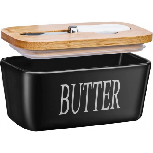 Емкость для масла изготовлена из керамики, крышка из бамбука, нож для масла из нержавеющей стали. Все материалы полезны для здоровья и безопасны для пищевых продуктов.